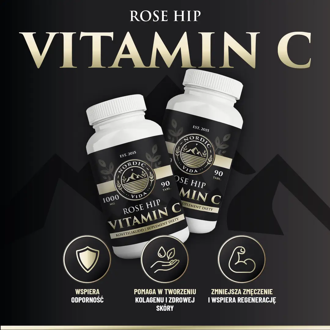Vitamin C + Rosehip marki Nordic Vida to wysokiej jakości suplement diety zawierający witaminę C wzbogaconą naturalnym ekstraktem z dzikiej róży (rosehip), wspierającą odporność, skórę i prawidłowe funkcjonowanie organizmu.